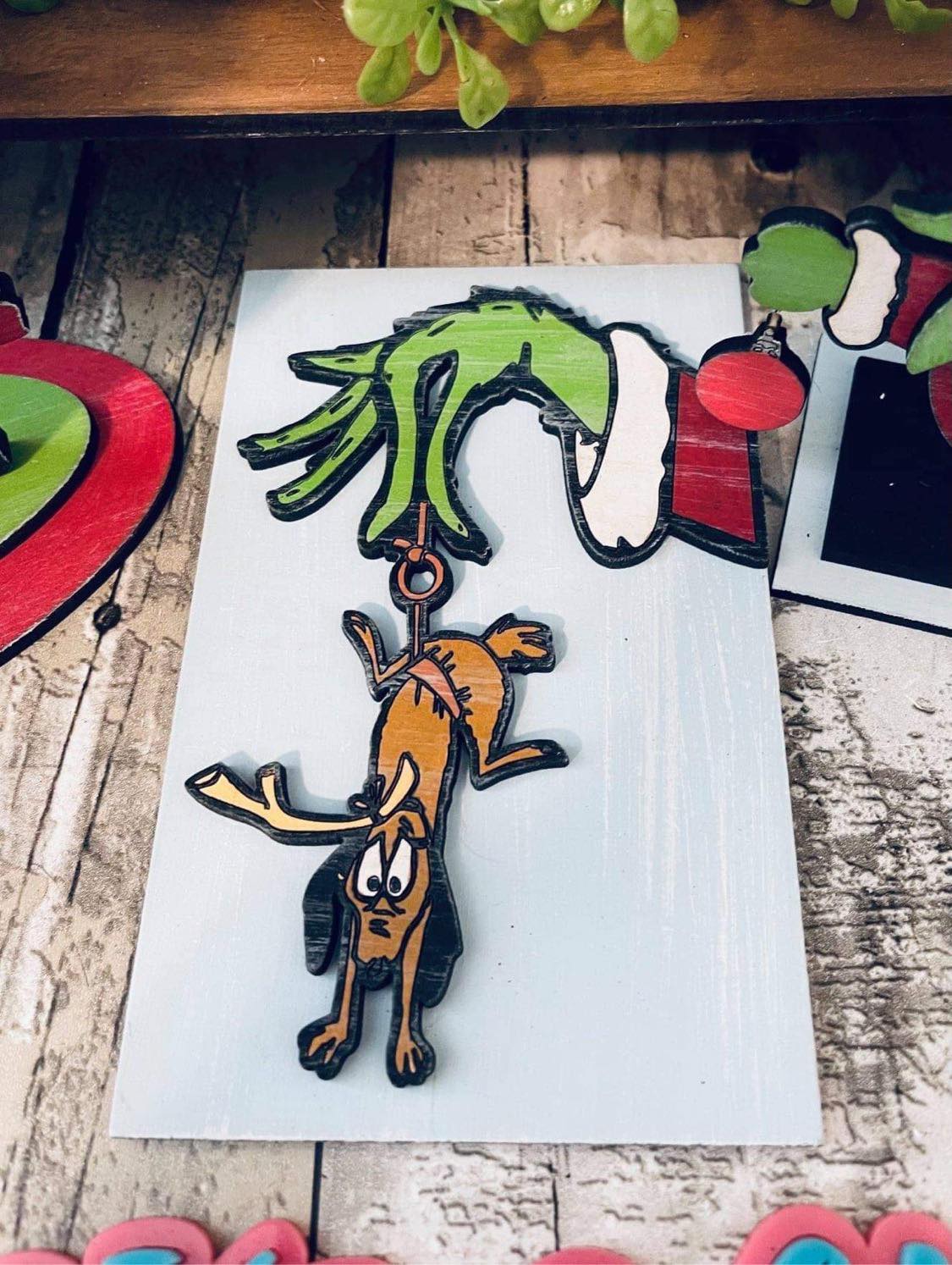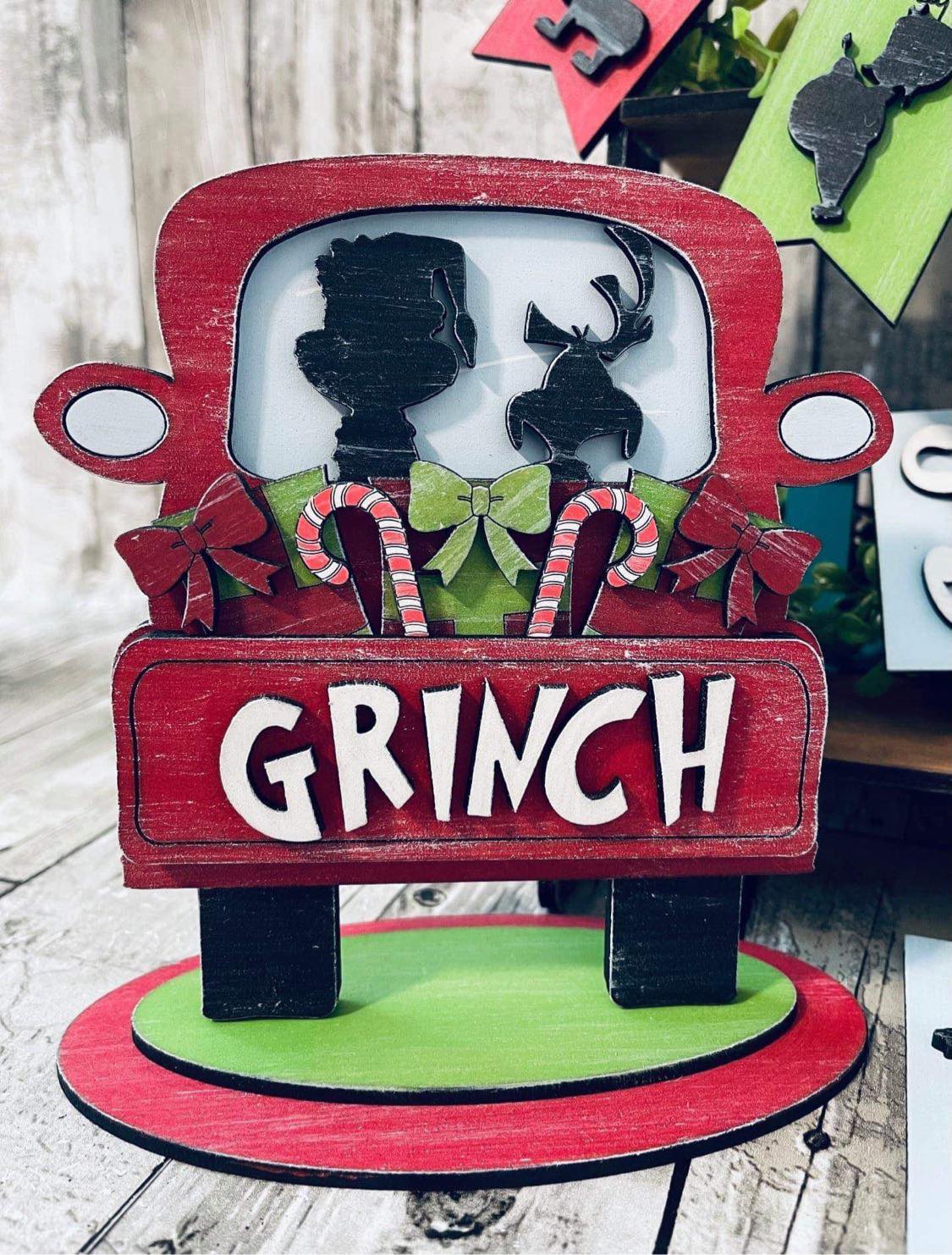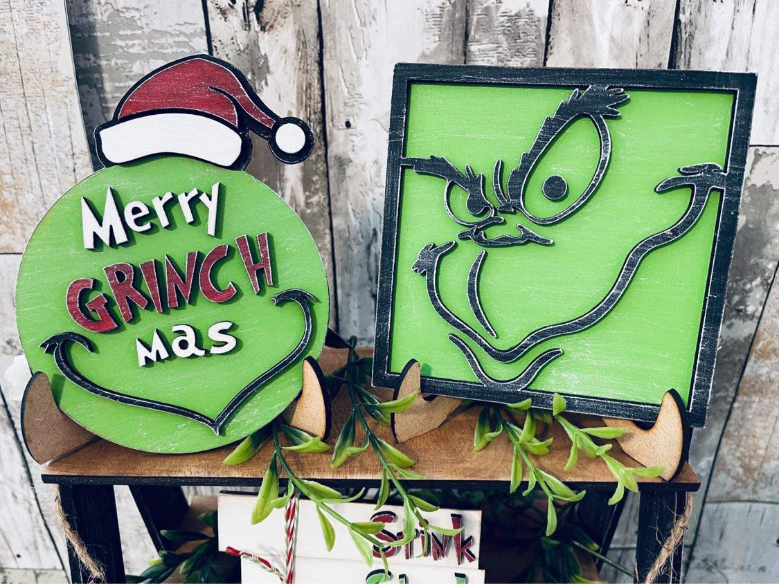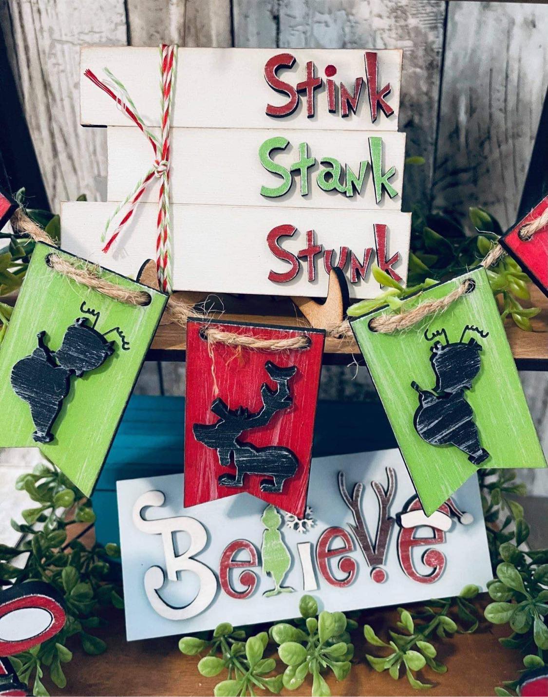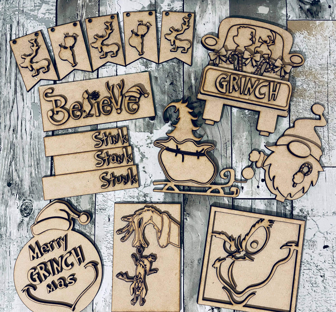 The 3D Grinch Tiered Tray set includes 9 blank pieces (Merry grinchmas, face, stink stack, banner, gnome, believe, hand with dog, truck and sled)